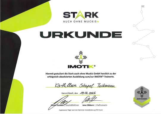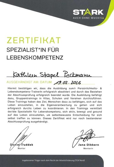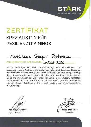 Meine Ausbildung zur Selbstbehauptungs,- und Resilienztrainerin habe ich bei "Stark auch ohne Muckis" absolviert, einem Konzept, das seit vielen Jahren Kinder dabei unterstützt, mutig, selbstsicher und sozial stark zu werden.